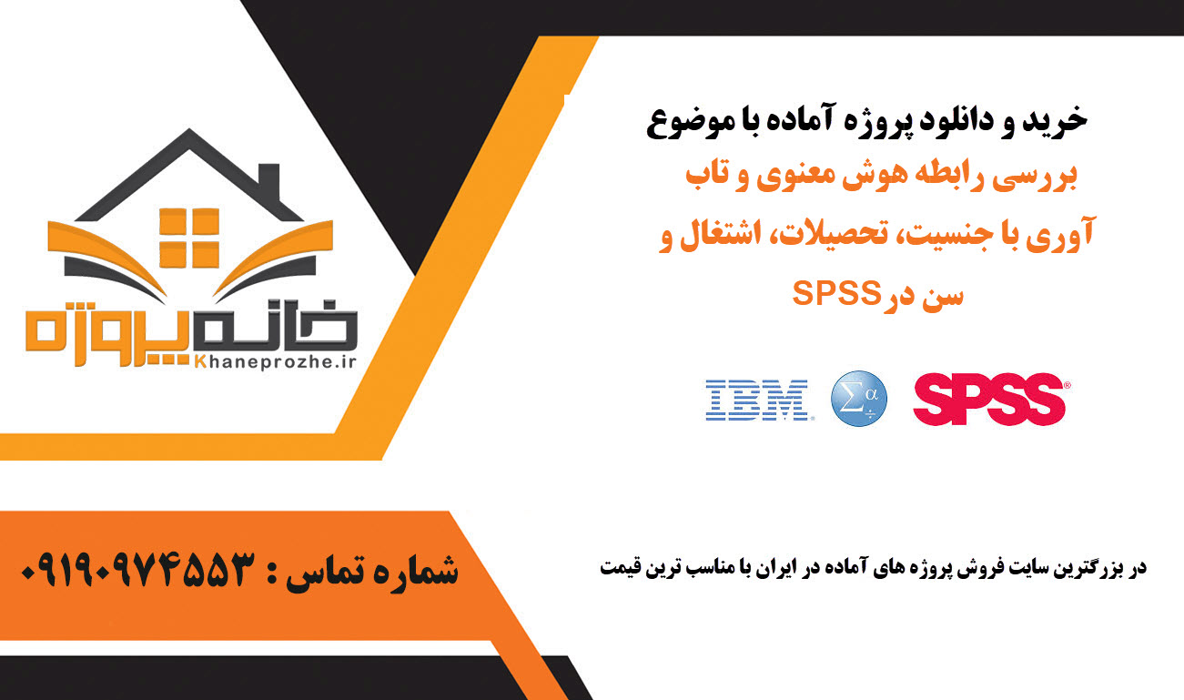سایت خانه پروژه یکی از بزرگترین سایتهای فروش فایل و پروژه در کشور است که با قرار دادن هزاران پروژه در حوزه ها و رشته های مختلف به مرجعی برای دانشجویان و شرکت های تجاری برای دریافت پروژه های آماده تبدیل شده است.در زیر پروژه ای آماده با موضوع“بررسی رابطه هوش معنوی و تاب آوری با جنسیت، تحصیلات، اشتغال و سن در SPSS”برای شما عزیزان قرار داده شده که توضیحات آن را در ادامه میتوانید مشاهده نمایید.این پروژه هم در انجام پروژه داده کاوی و هم در انجام پروژه spss در حوزه های دیگر کمک کننده می باشد.