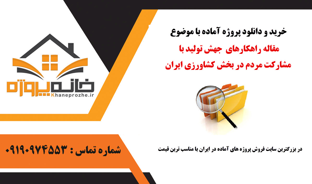 سایت خانه پروژه یکی از بزرگترین سایتهای فروش فایل و پروژه در کشور است که با قرار دادن هزاران پروژه در حوزه ها و رشته های مختلف به مرجعی برای دانشجویان و شرکت های تجاری برای دریافت پروژه های آماده تبدیل شده است.در زیر پروژه ای آماده با موضوع“مقاله راهکارهای جهش تولید با مشارکت مردم در بخش کشاورزی ایران”برای شما عزیزان قرار داده شده که توضیحات آن را در ادامه میتوانید مشاهده نمایید.