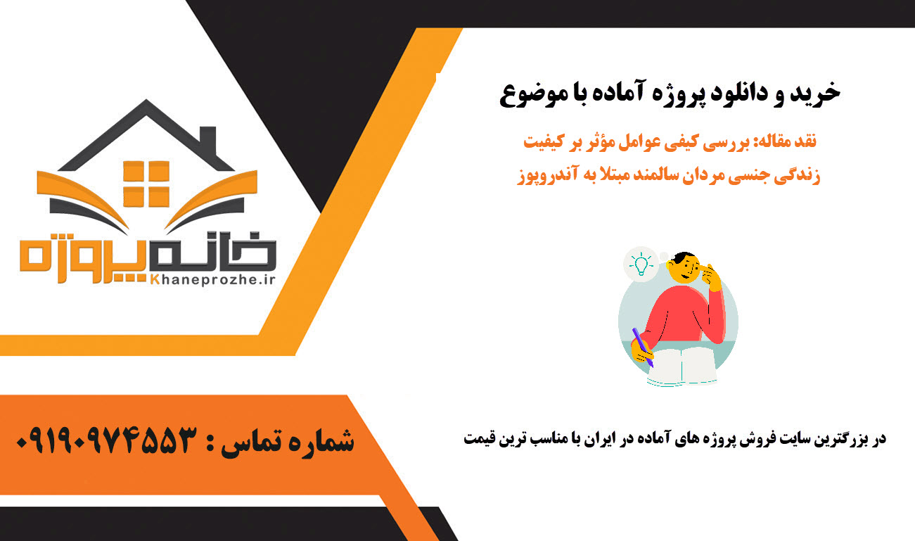 سایت خانه پروژه یکی از بزرگترین سایتهای فروش فایل و پروژه در کشور است که با قرار دادن هزاران پروژه در حوزه ها و رشته های مختلف به مرجعی برای دانشجویان و شرکت های تجاری برای دریافت پروژه های آماده تبدیل شده است.در زیر پروژه ای آماده با موضوع“نقد مقاله: بررسی کیفی عوامل مؤثر بر کیفیت زندگی جنسی مردان سالمند مبتلا به آندروپوز”برای شما عزیزان قرار داده شده که توضیحات آن را در ادامه میتوانید مشاهده نمایید.